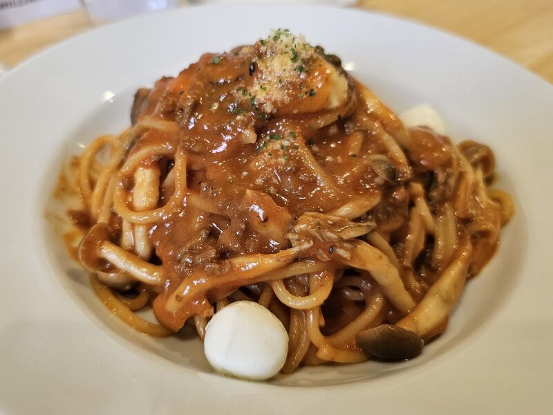 こちらは奥さんが頼んだ、きのこのクリーミーミートソースパスタ。