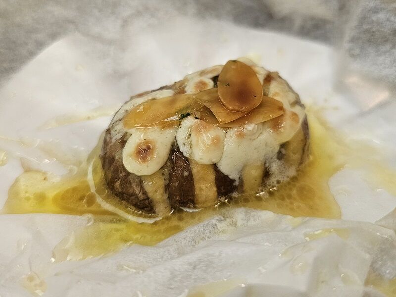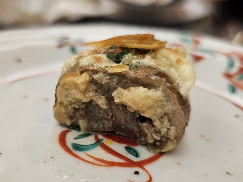 マッシュルームをスライスして、そこに何か挟んであったんですが、僕の安い舌ではその何かがよくわからず・・・