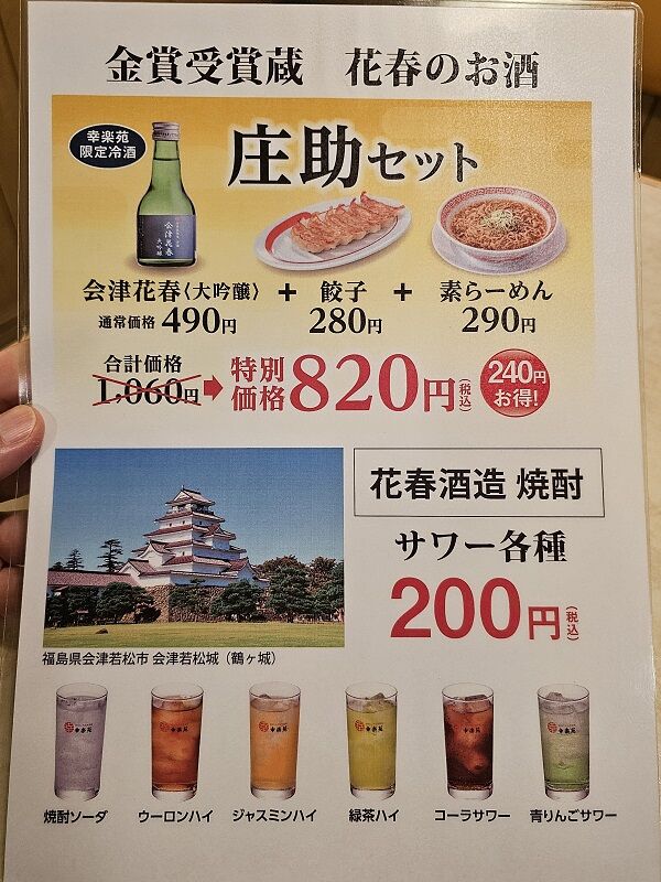 庄助セット、ビールじゃなくて「会津花春」ってところが流石ですね。
