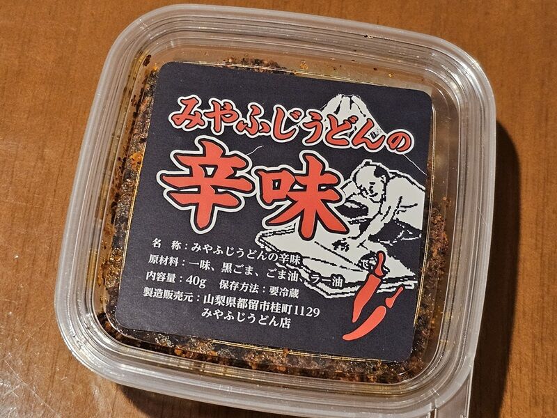 みやふじうどんさんは、山梨県都留市、都留文科大学の隣駅あたりにある手打ちうどんの有名店のようですね。これはこちらのお店に置いてある辛味のようですが、そのお方がわざわざ買ってきてくれたっていうことは、きっとかなり辛い調味料に違いない!