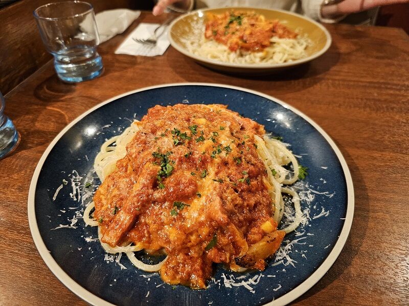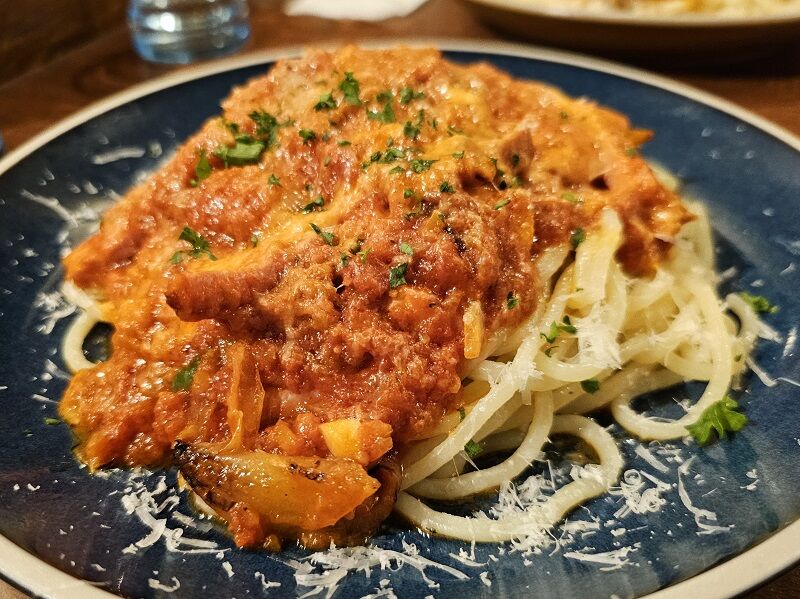 「3種チーズとベーコンの辛いトマトソース」のスパゲッティ。生パスタはいかにもモチモチした食感を期待させるビジュアル。2.4mmという太さがそう思わせるんでしょうね。