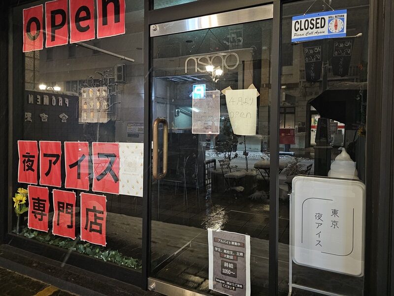 東京夜アイスさん、このところずっと営業している様子がなくて心配してたんですが、今日前を通ったら「4月よりopen」の文字が!