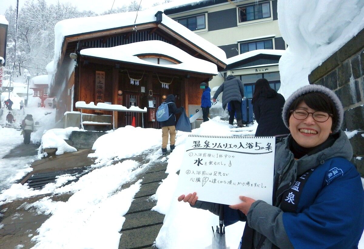下湯共同浴場では山形商業高校の生徒もイベントに参加。