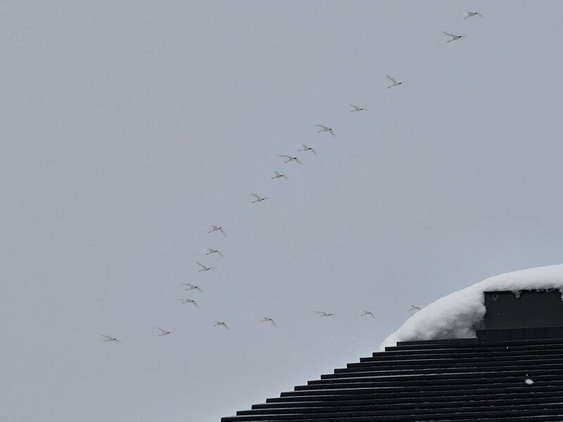 今日の午後、空からにぎやかな鳴き声が聞こえてくると思ったら、白鳥の北帰行でした。