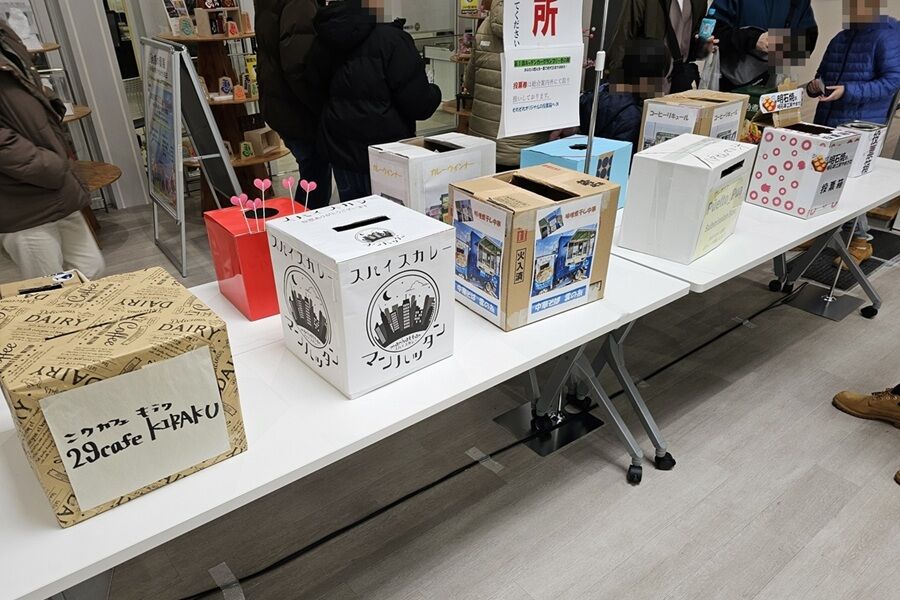 道の駅の総合案内で投票権をいただいて、お店の投票箱に入れるシステム。