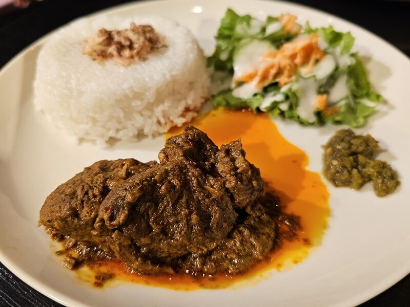 手前の牛肉がそれで、ルンダンというのはお肉をココナッツミルクとスパイスで煮込んだ料理のことらしい。これは牛肉だからビーフルンダンなのね。