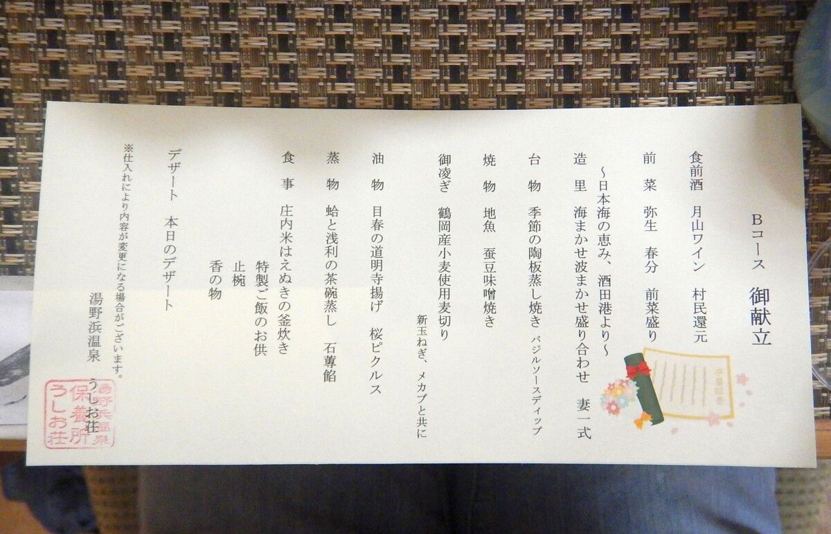 今回はうしお荘にスタンダードなお料理が頂けるBコースで宿泊しました。