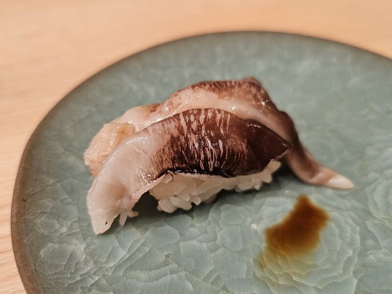 最初の握りをまだ食べきってもいないところで次のお寿司。