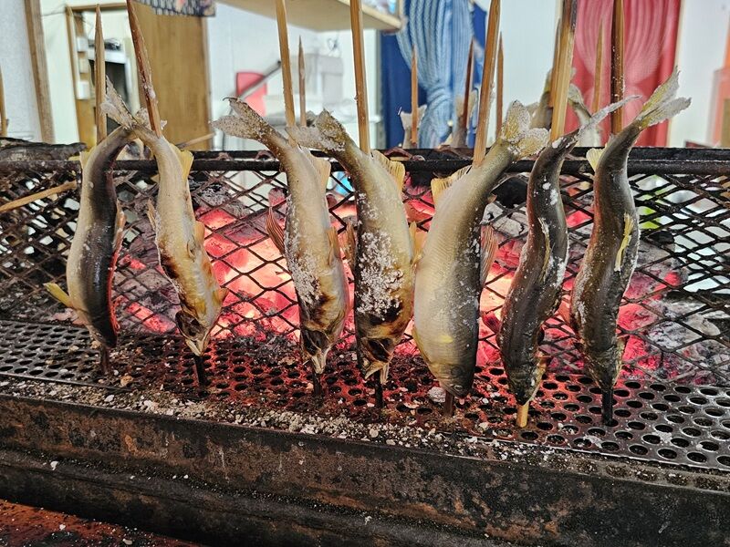 なので他の直売にも行ってみたんですが、この写真は最上町の産直、最上四季香さんにお邪魔したときのもの。ヤナ茶屋もがみさんに併設のため、美味しそうな塩焼の匂いが漂ってたんですよね。