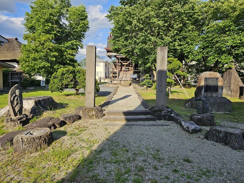 拝殿に至る参道は二段の段差があって、これは上の段にある石碑3つ。