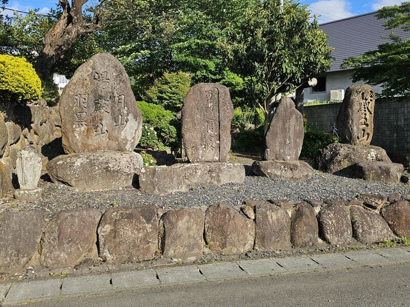 その左から、十八夜塔、蔵王山、ひとつお墓のような石塔を挟んで湯殿山。