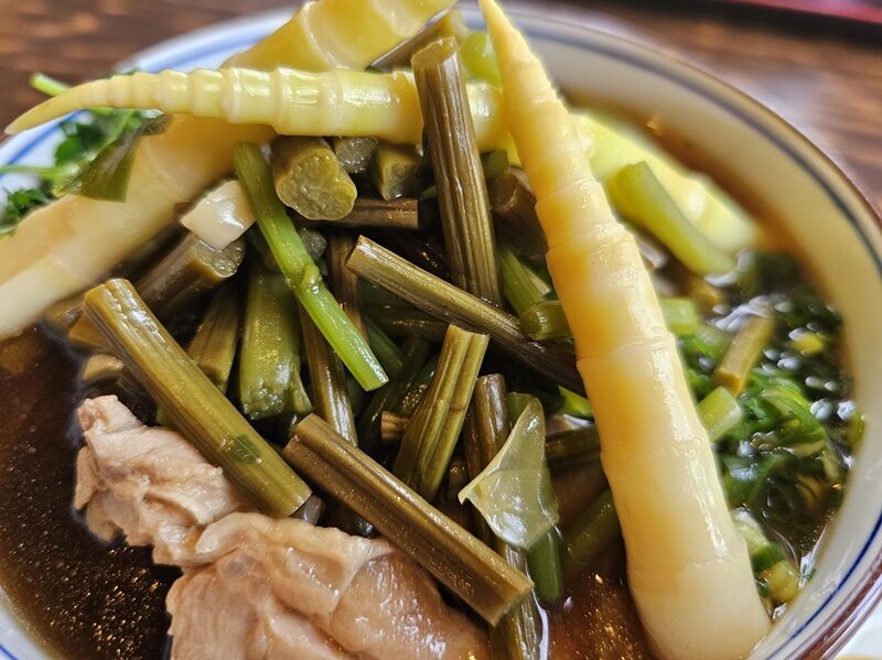 極・天然山菜そば。材料は根曲がり竹、ミズ、ワラビということですが、ご主人が直接採取してきた天然物、と書いてありますね。