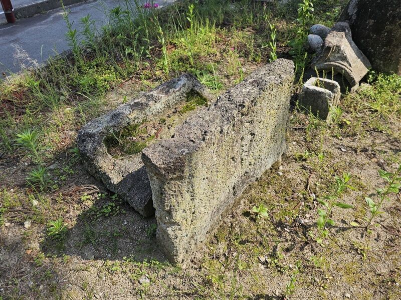 真ん中にある四角っぽい庚申塔は途中で壊れていたんですが、近くで見てみたら上の部分が折れて後ろに落ちていました。