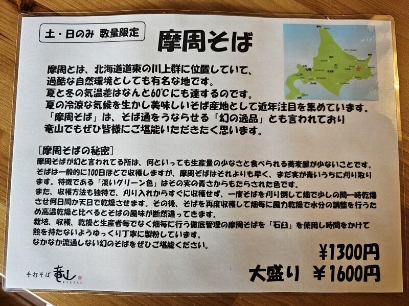 確か前回は普通に盛りそばを食べたんですが、そのときの印象がとてもよかったんですよね。なので今回もこちらに来てみたんですが、メニューを見てたら「摩周そば」なるものがあるじゃないですか!