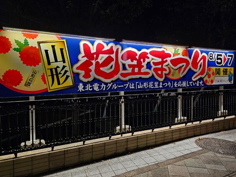 楽しい飲み会の帰り道、花笠まつりの看板が。いよいよ夏ですね~!