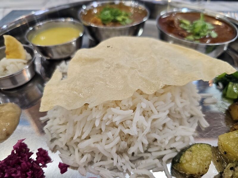 中央のごはんの上にのってるのは、豆のせんべい、パパドとありました。