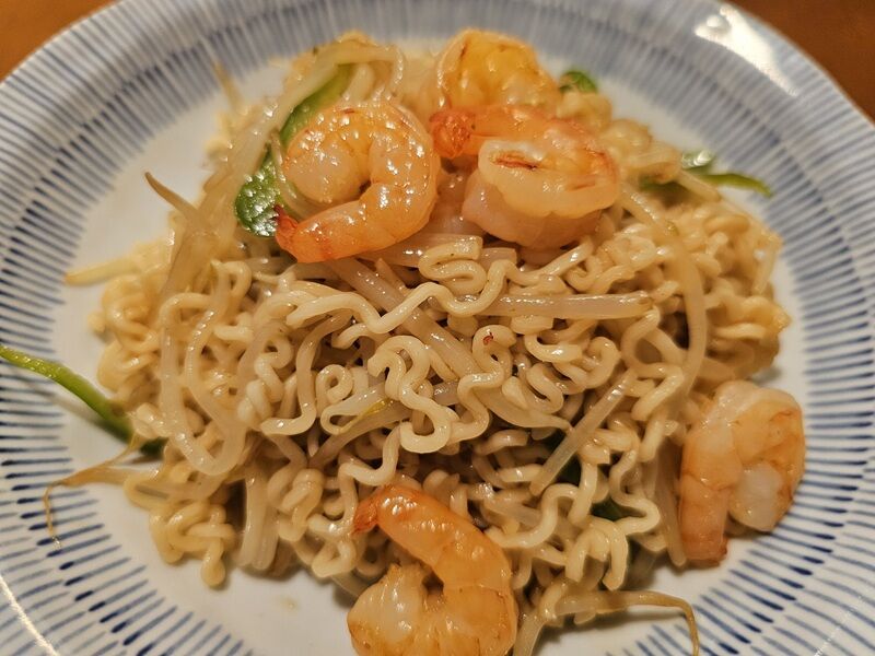 麺を3分茹でたら付属のオイルと粉末ソースをかけるだけという簡単調理なんだけど、さすがは奥さん、エビや野菜も入れてくれました。
