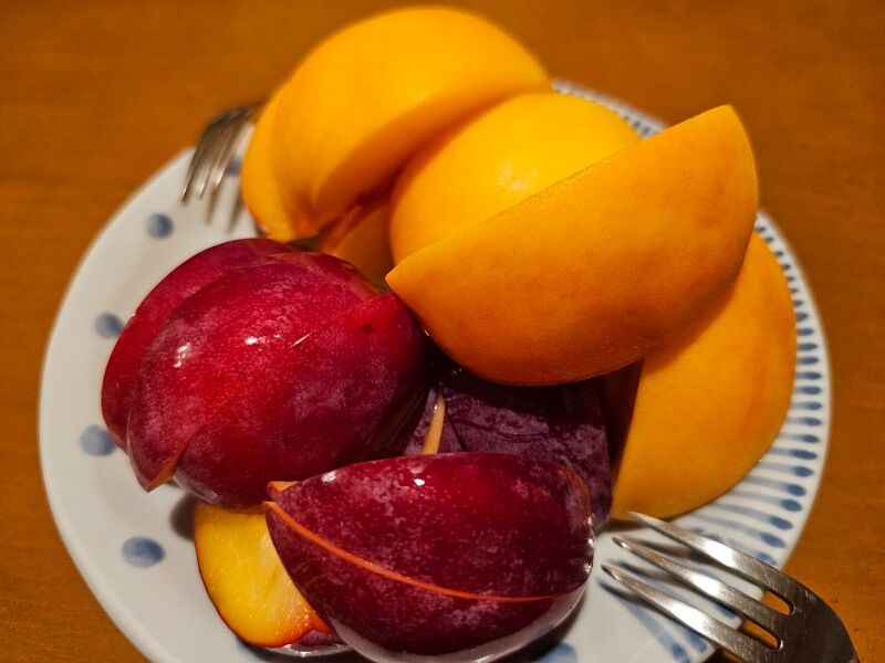 激辛カレーで燃えている胃を、冷えた黄金桃とスモモでクールダウン。スモモはいつもお世話になっている方にいただいたもの。ちょっとした酸味がスモモらしくて美味しいね。そして黄金桃も、言うまでもなく美味しいよなぁ~♪
