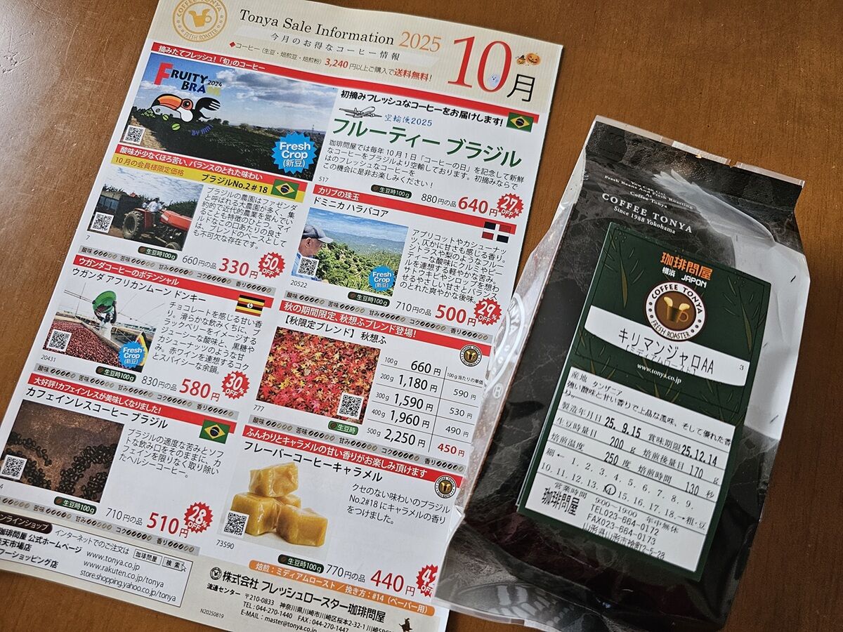 今日はアプリ会員の当日入会で、今月のコーヒー(キリマンジャロ)が半額でした!