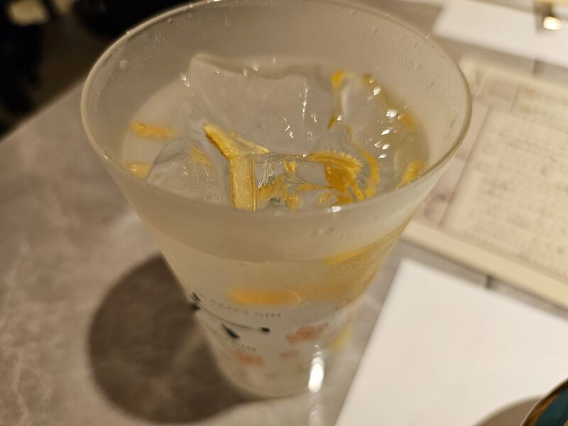 日本ならではの6つの旬の食材(桜花、桜葉、煎茶、玉露、山椒、柚子)を浸漬して香りを移したジンをソーダ割にしたものなんですが、お向かいの方は桜を選んだんですよ。