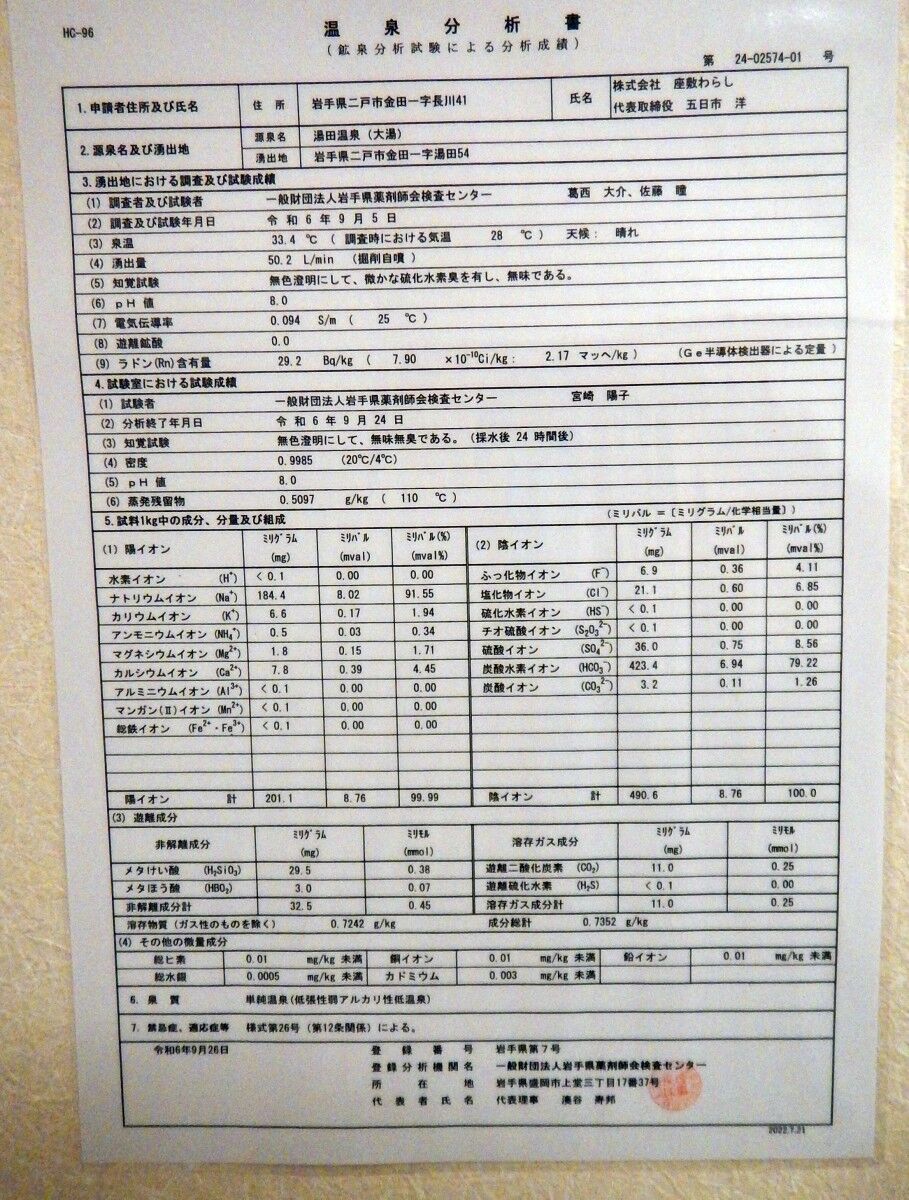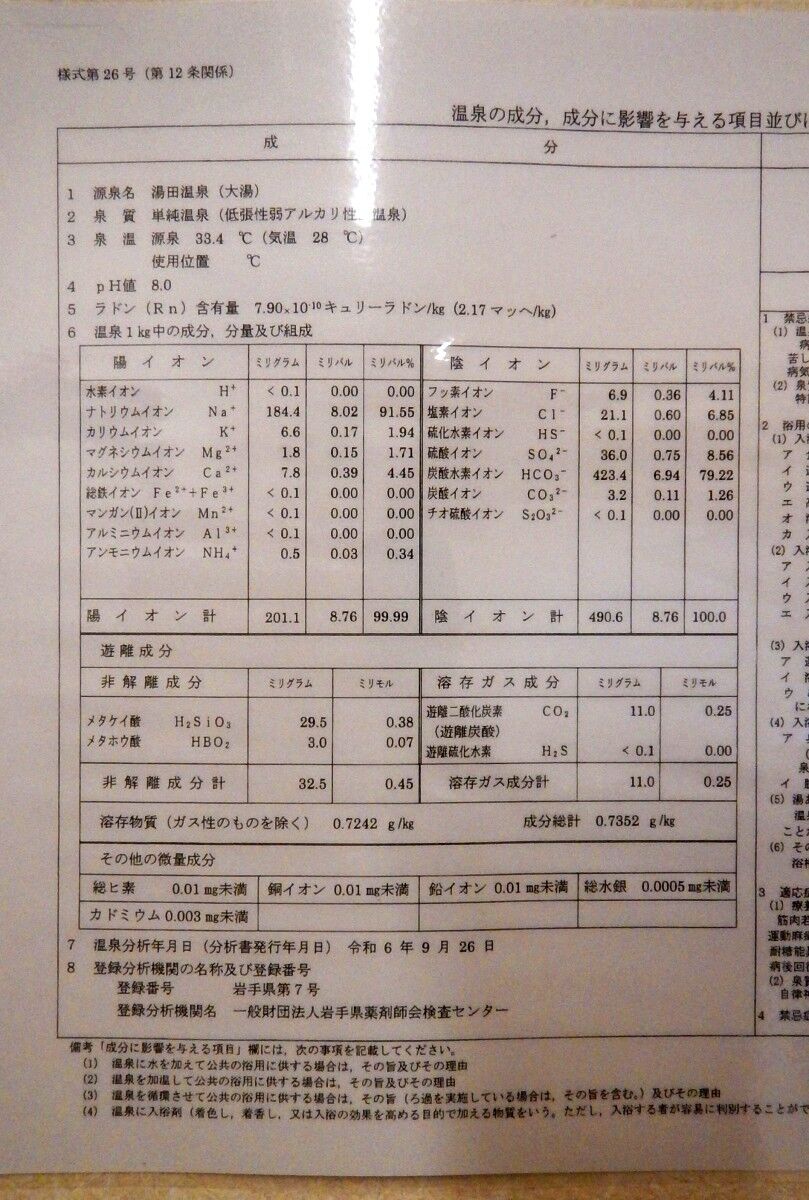 濃度はさほど濃くない柔らかいお湯で、弱アルカリ性で炭酸水素が豊富な美肌の湯です。