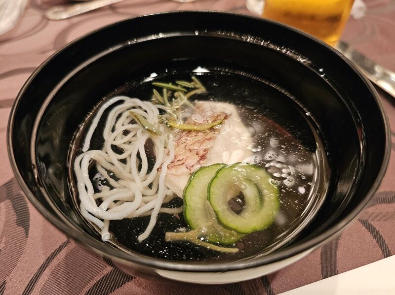 続いてのお椀は、焼き鯛、紐真薯、蛇の目胡瓜、順才、柚子。