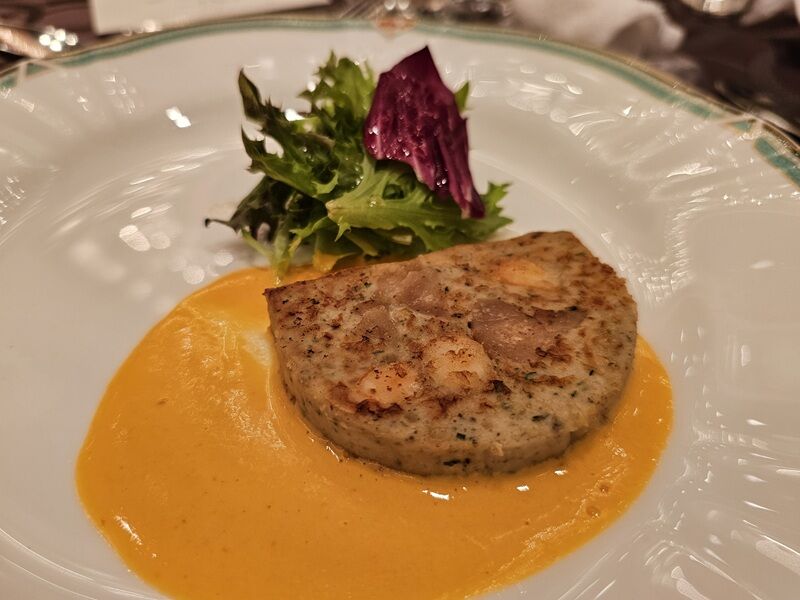 「天使の海老」、「リー・ド・ヴォー」、「山形ハーブ鶏」の温かいテリーヌ メスクランサラダ添え。