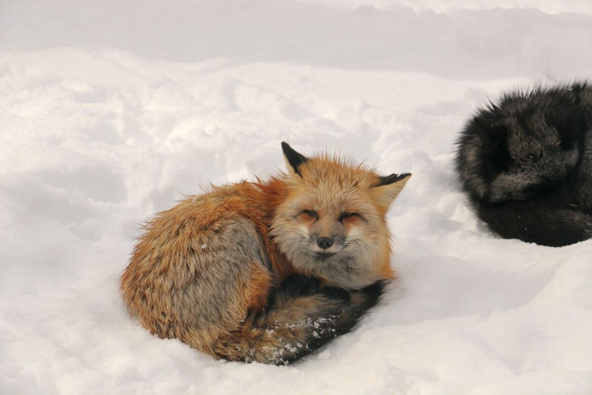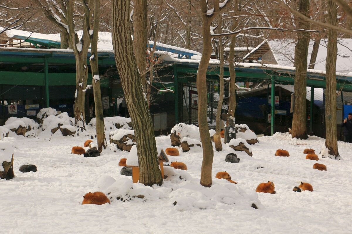 寒いからかキツネたちは至る所で丸くなっています。