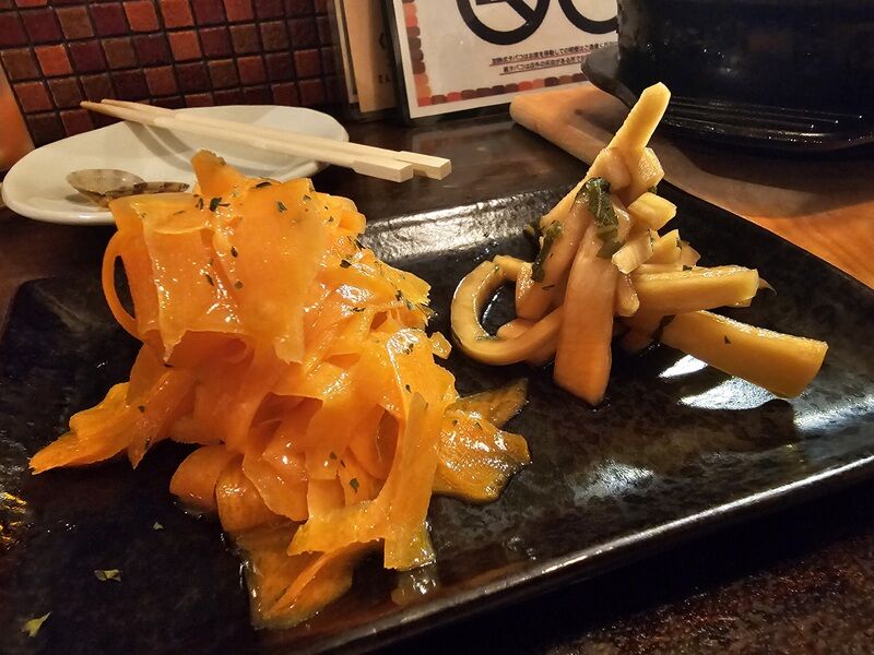 マスターからいただいたニンジンのサラダとお漬物。