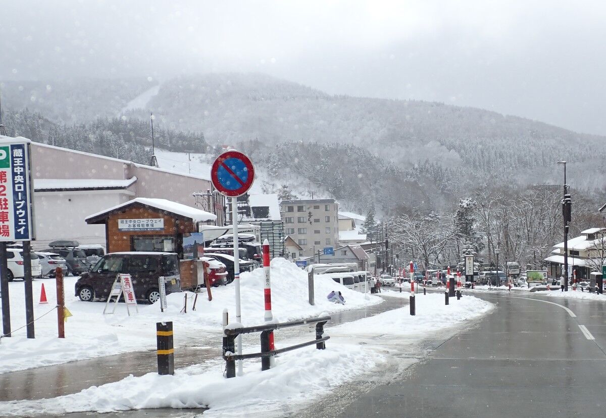 スキーウェアを着た人が歩き回っていますし、ロープウェー乗り場の駐車場はどこも満車です。