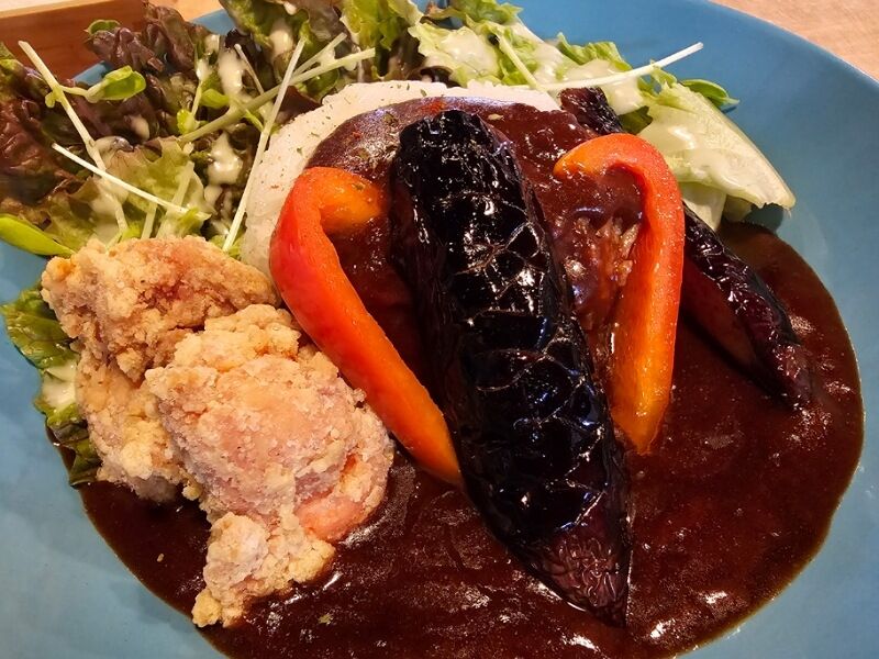ちょっと甘めのルーに、ナスと唐揚げがのってます。それともう一つ、赤ピーマンかパプリカか・・・