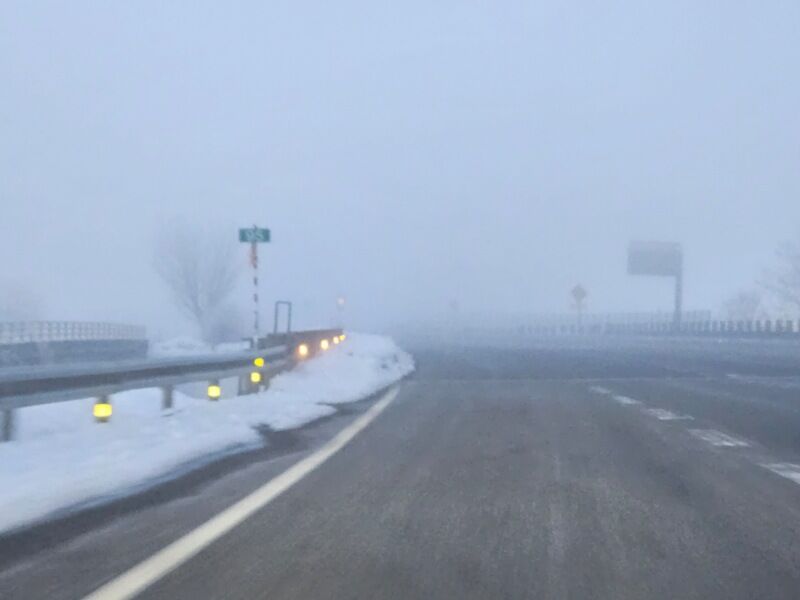 途中の東北中央道ではようやく空が明るくなってきましたが、こんな霧深い中を走ってました。