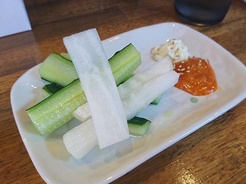 悩んだ結果、怖いもの見たさというかブログのネタ的にというか、チーズカレーラーメンをお願いすることにしたよ。そして注文すると、最初の看板で見ていたとおりこのスティックサラダ的な一皿がサービスで出てきたよ( ´艸`)