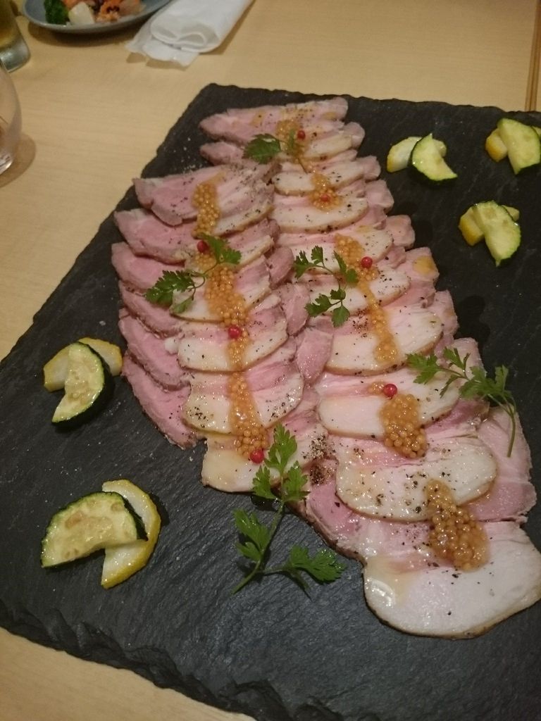 黒いプレートの上にきれいに並べられたお肉。粒マスタードの酸味が良いアクセントになっており、肉の味もしっかりしています。
