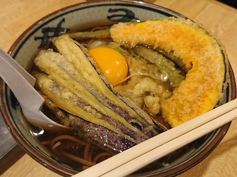 天ぷらそばは海老天だったので、あえてのかけそば+野菜天ぷら+生卵。
