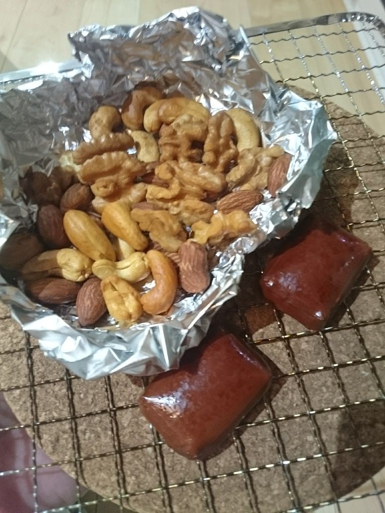 今回はミックスナッツとベビーチーズ。ミックスナッツはアルミホイルで作った皿に載せました。