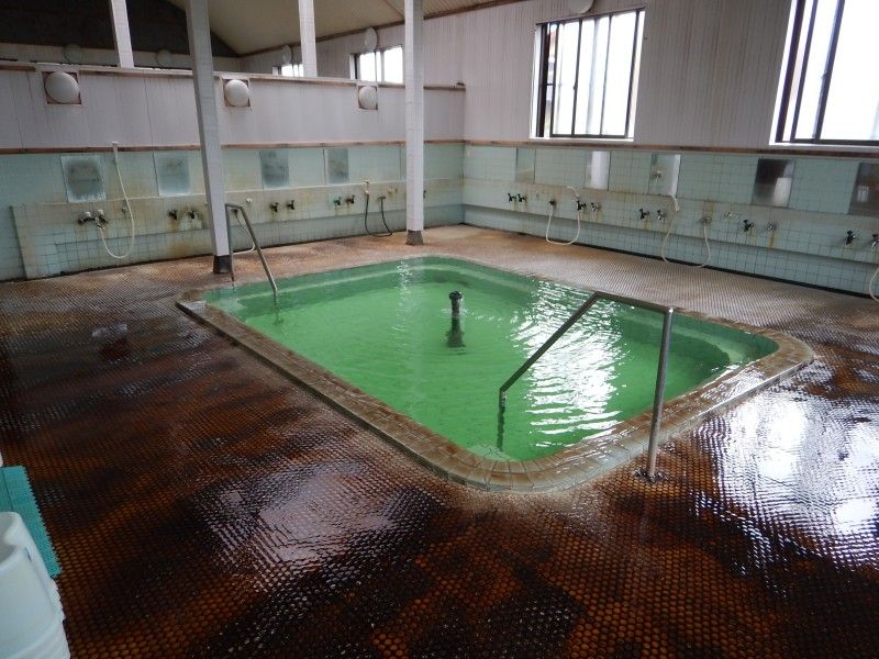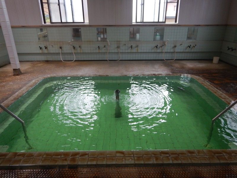 タイル張りの浴槽に美しいエメラルドグリーンのお湯が湛えられています。