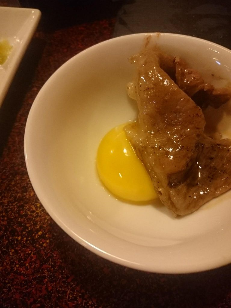 コンロで焼いたお肉を卵の黄身に絡めていただきます。
