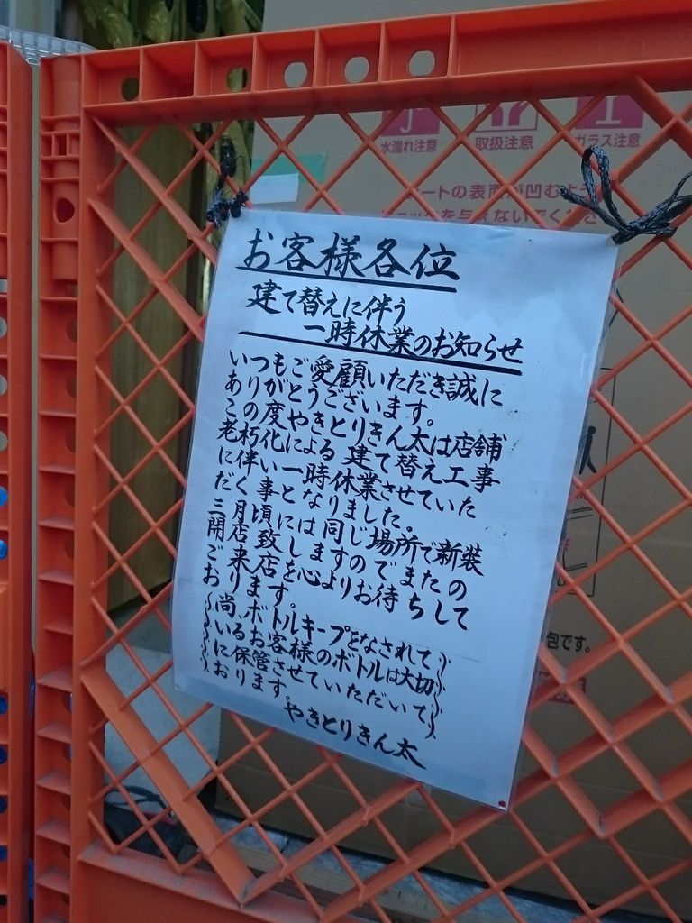 建物の前に設置された柵に張り紙がしてあったので見てみると「やきとりきん太」の建て替え工事の案内でした。