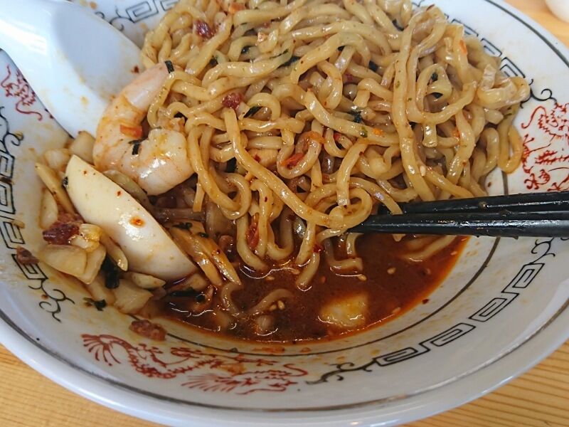 このエビ、生じゃないよな…とかいろいろ思いましたが、まずは麺を混ぜ混ぜしていると桜エビやらスープやらが跳ねるから、そんなことを考えている余裕もなくなります(笑)