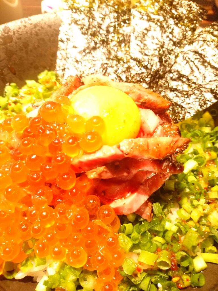 丼の中にはローストビーフとイクラ。