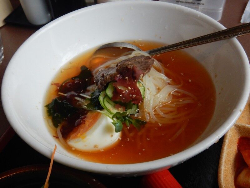 最初は辛みの無い万人向けなので、好みで小皿のキムチを追加です。