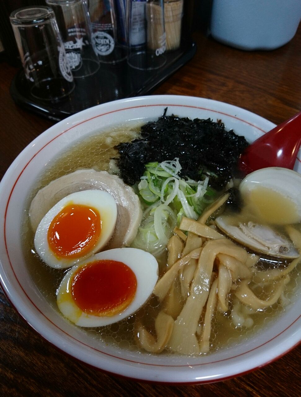 券売機やメニューには載っていないので分かりづらいけど、通常の中華そばにメンマ、煮玉子、ネギ、岩海苔などのトッピングを追加したいわゆる全部のせ。