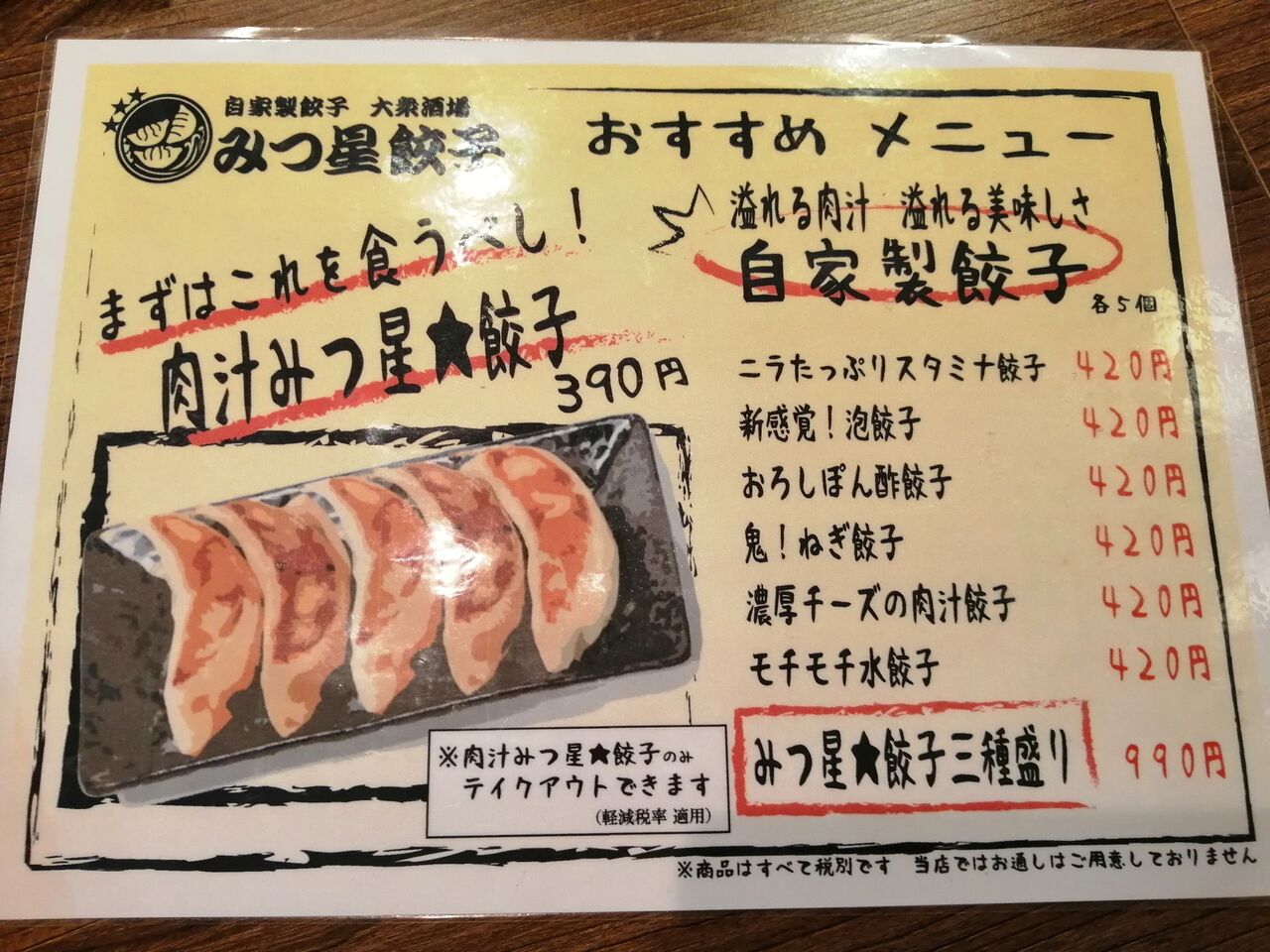 「肉汁みつ星餃子」1種類のみだけど持ち帰りもできます。しっかり持ち帰りしました(*´ω`*)。