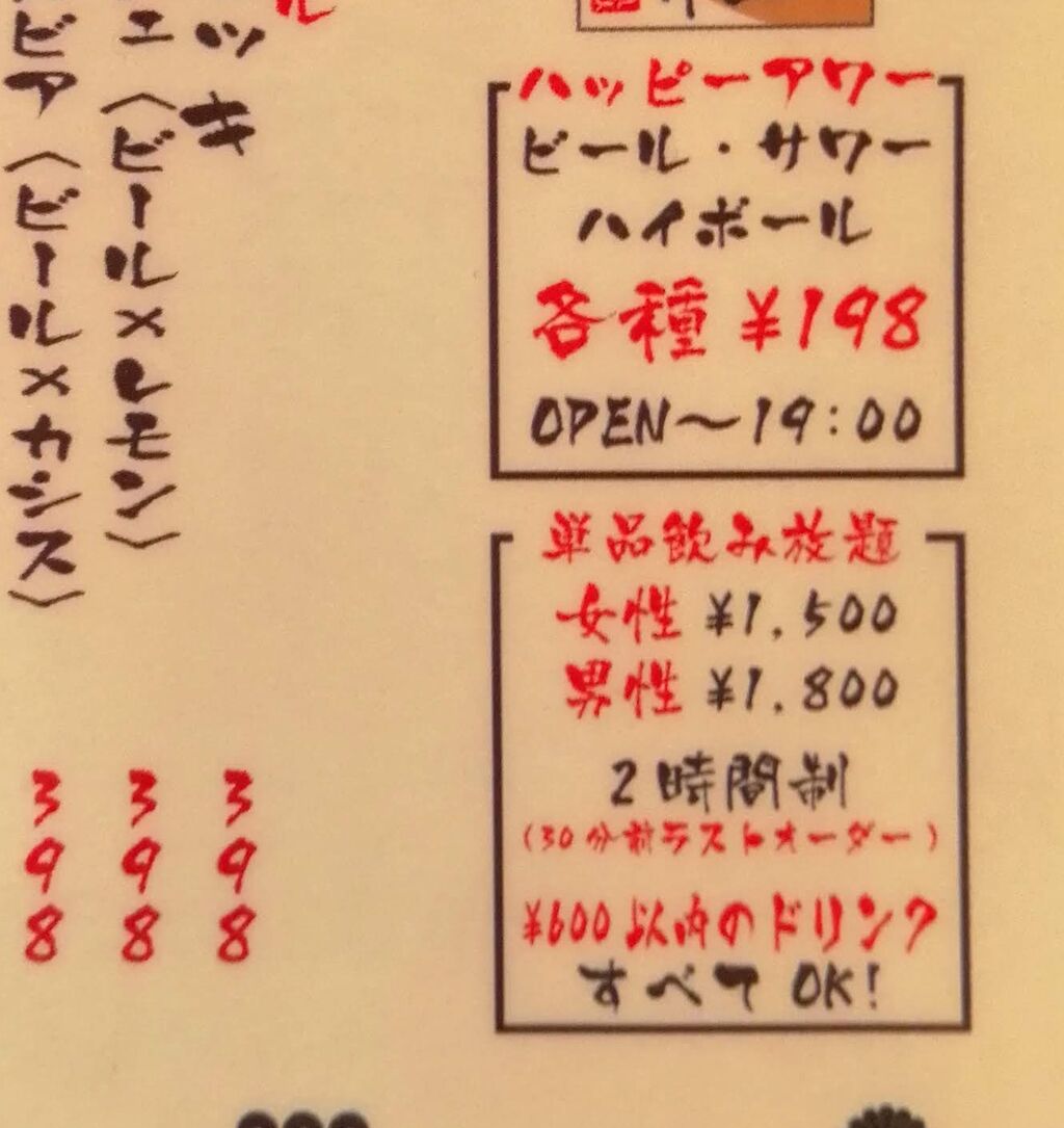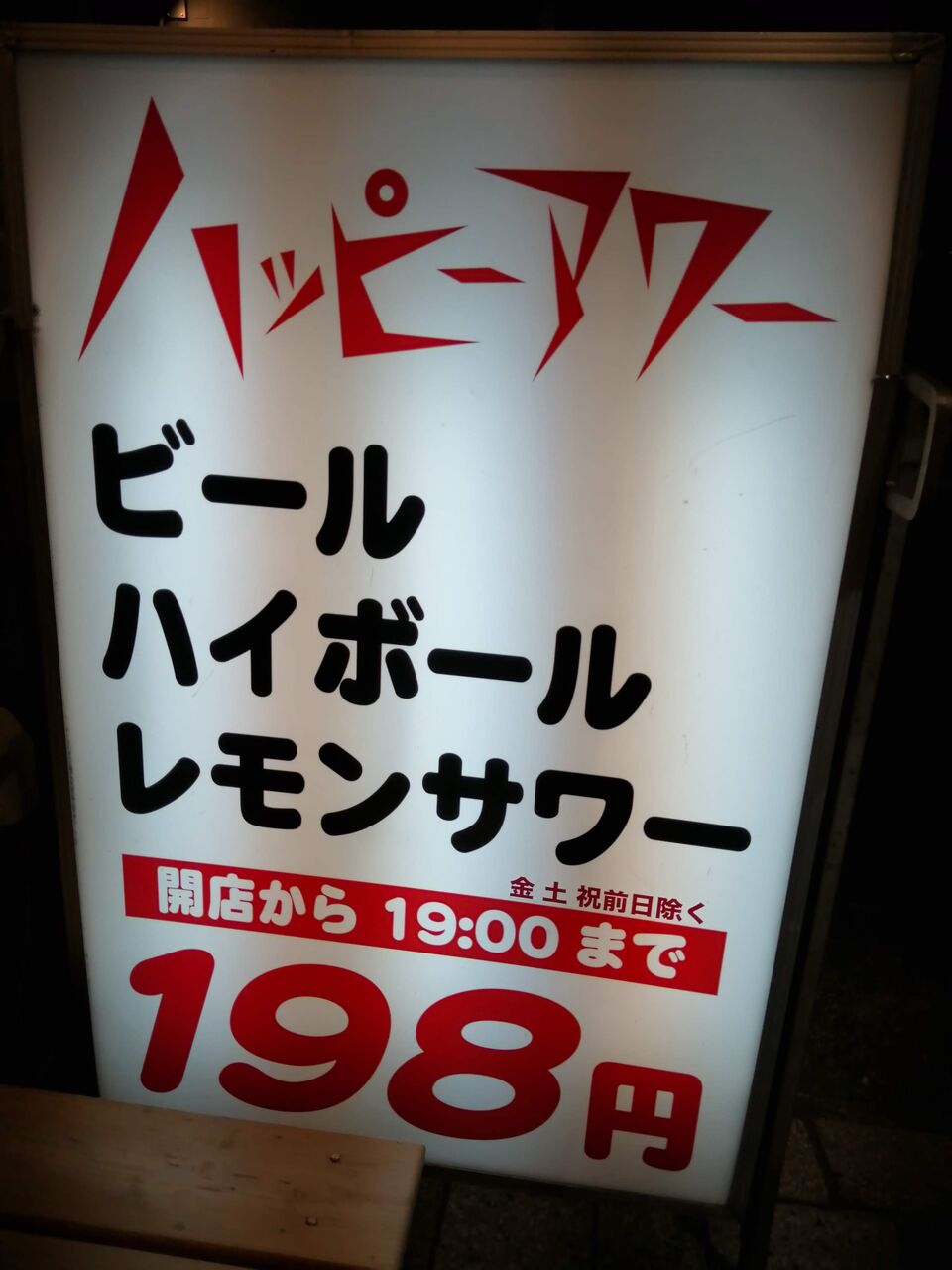 開店の16:30から19:00までのあいだビール・ハイボール・サワー類を198円で飲むことができるんです。