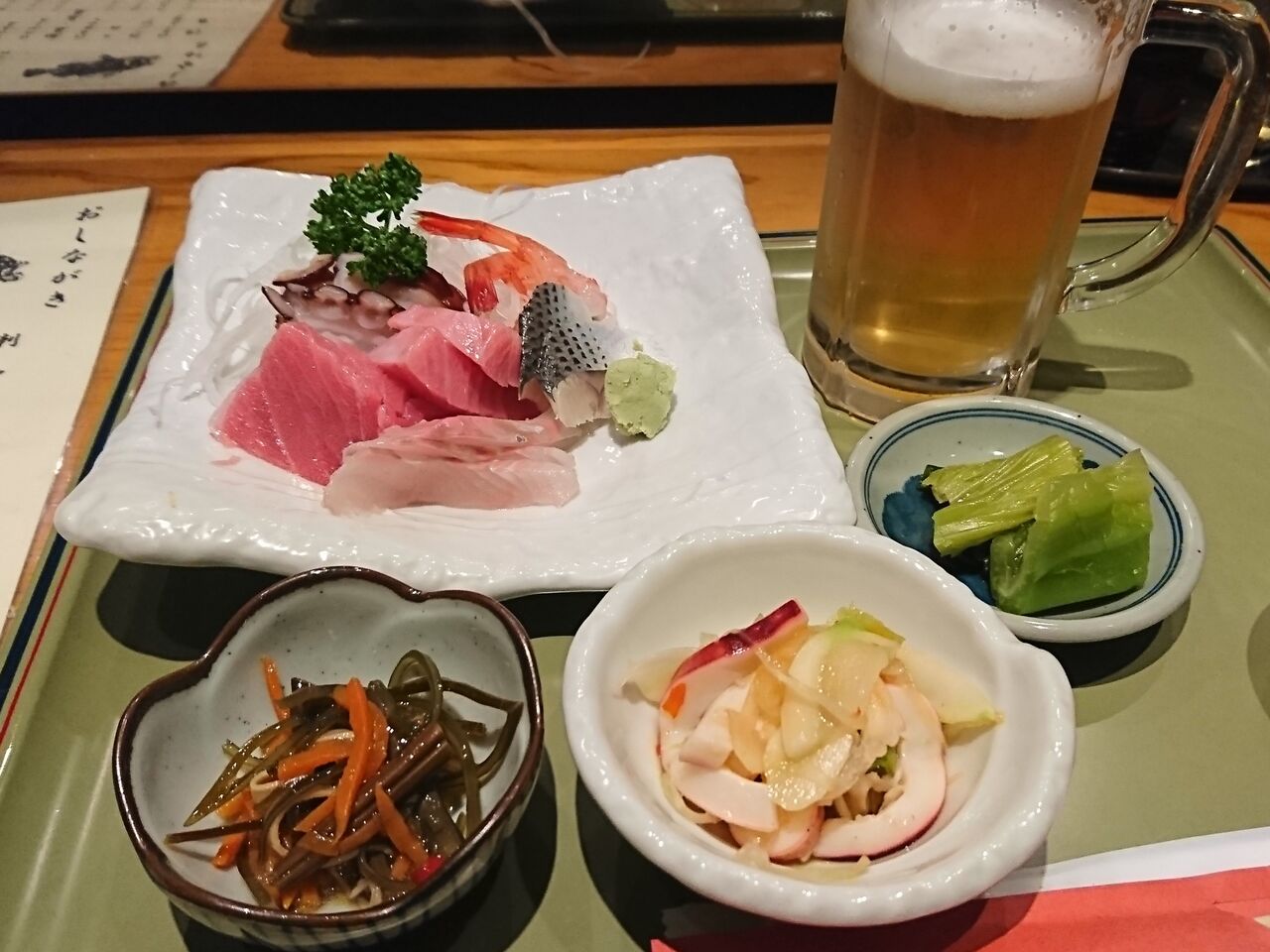 生ビールをお願いして、いつものように「料理の写真撮らせてもらっていいですか?」と聞くと「いま刺身も出すから、それ出てから撮った方がいいよ」と、ブロガーの気持ちを察したお答え(笑)